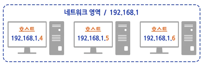 '네트워크 영역'의 경우 IP 주소 앞부분에 위치하며, 특정 네트워크를 식별하는 데 사용됩니다.