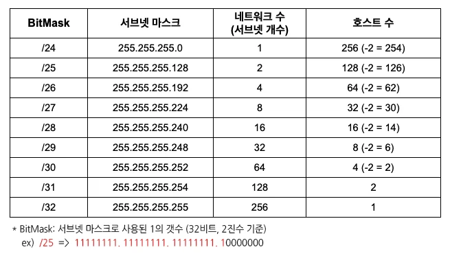 * 호스트 영역에서 네트워크 주소와 브로드캐스트 주소 2개는 사용할 수 없습니다.