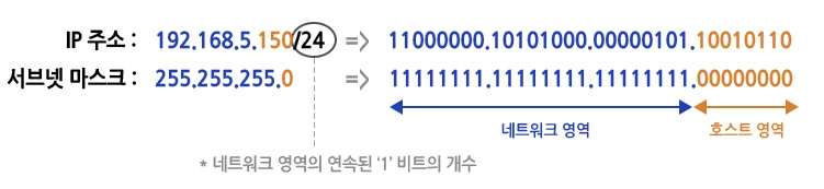 네트워크 영역을 나타내는 비트는 '1' 호스트 영역을 나타내는 비트는 '0'으로 설정되며, 어디까지가 네트워크 부분인지 구분하기 위해 반드시 '1'이라는 비트 값이 연속되어야 합니다.