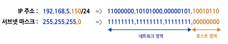 (네트워크 주소: 특정 네트워크를 식별하는 데 사용되는 IP 주소로 호스트 부분에 해당하는 비트를 모두 0으로 설정하여 네트워크 주소를 계산)