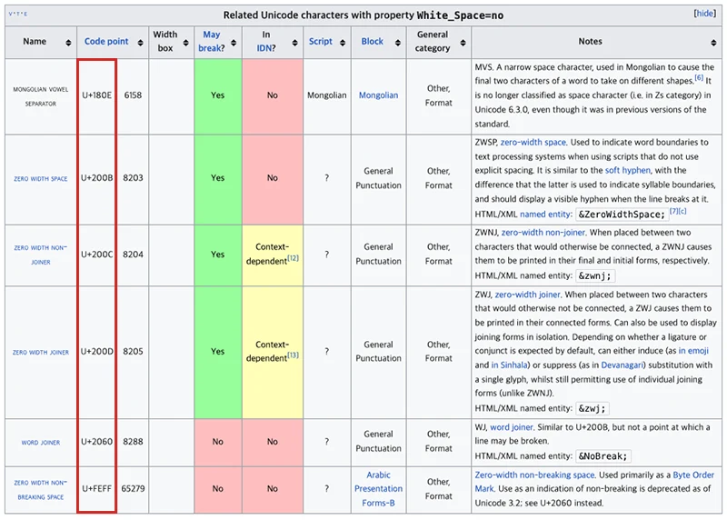 ZWSP에 대해 알아보는 과정에서 일반적으로 사용되는 스페이스(Space / U+0020), 탭 문자(Tab / U+0009), 개행 문자(Newline / U+000A or U+000D), 비공백 문자(NBSP, U+00A0) 외에 유니코드 기준 다양한 공백 문자들이 있다는 것을 알게 되었는데요.