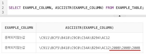 그리고 해당 데이터를 'ASCIISTR()' 함수를 사용해서 다시 확인해 본 결과 문자열 맨 뒤에 '\200B'라는 값이 붙어있는 것을 확인할 수 있었는데요.