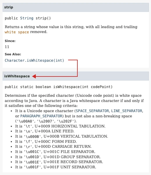 Java 11부터 도입된 'strip()' 메서드 역시 'Character.isWhitespace(int)'에 해당되는 공백을 제거하지만 ZWSP(U+200B) 등, 원하는 공백을 제거하지는 못한다는 것을 확인했습니다.