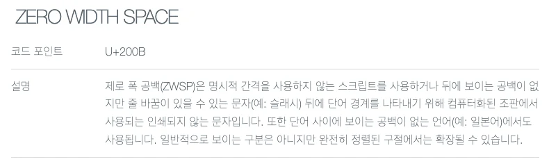 'Zero Width Space(ZWSP)'란 단어 그대로 '폭이 없는 공백'을 뜻하는데요.