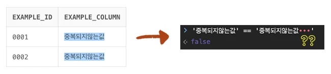 관련된 데이터 쪽 문제가 있어 확인하던 중 해당 컬럼에 다음과 같이 중복된(사실은 중복이 아니라 동일한 것처럼 보이는) 값이 들어가 있는 것을 볼 수 있었습니다.