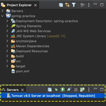 1번 과정을 통해 Servers 탭을 열면 화면 이미지와 같이 하단에 해당 탭이 추가된 것을 확인할 수 있는데요.