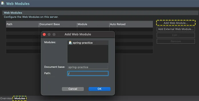Web Modules 설정은 Overview 탭 오른쪽에 위치하고 있으며, 'Add Web Module...' 버튼을 통해 신규 웹 모듈을 등록하거나 'Edit...' 버튼을 통해 등록된 웹 모듈 정보를 수정할 수 있습니다.