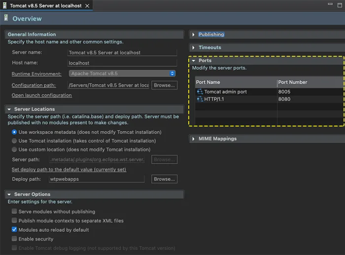추가된 서버에 대한 추가적인 설정을 위해 해당 서버를 더블 클릭하면 다음과 같은 Overview 페이지를 확인할 수 있으며, 여기서 서버의 기본적인 설정과 더불어 'Ports' 부분을 통해 서버가 실행될 포트 및 tomcat admin 포트를 지정할 수 있습니다.