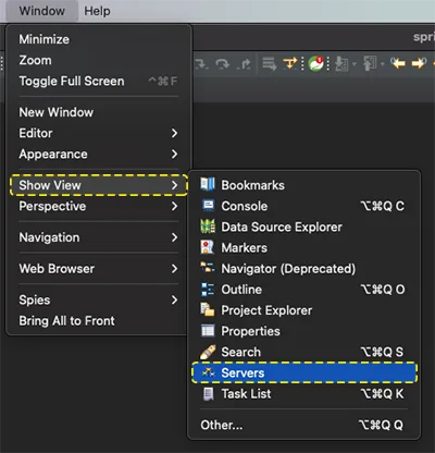 이클립스에서 서버를 추가하기 위해서는 먼저 'Window' -> 'Show View' -> 'Servers' 경로를 통해 Servers 탭을 열어줍니다.
