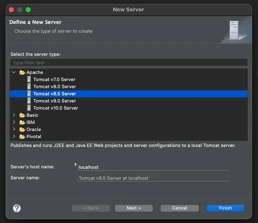 이어서 New Server 화면을 통해 추가할 서버(예시에서는 Tomcat v8.5)를 지정합니다.