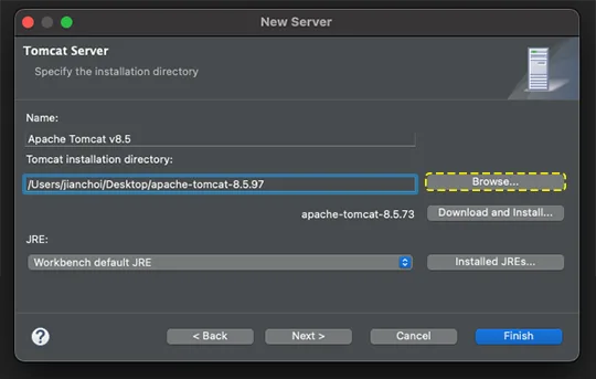 톰캣의 경우 bin, conf, lib, webapps 등의 디렉터리 외 파일들이 포함되어 있는 전체 tomcat 디렉터리(여기서는 apache-tomcat-8.5.97)를 설정하면 됩니다.
