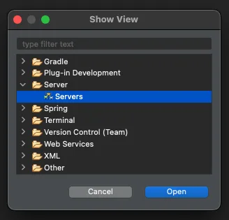 만약 Servers 탭이 없다면 Other... 탭을 열고 아래 이미지와 같이 'Server' 하위에서 'Servers'를 찾을 수 있습니다.