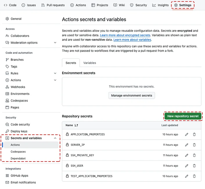 repository 상단의 'Settings' -> 'Secrets and variables' -> 'New repository secret'을 통해 각각의 properties 파일을 git에서 등록, 관리하여 ci/cd 과정에서 사용할 수 있습니다.