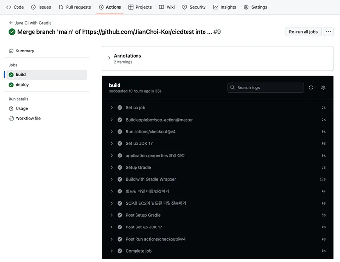 repository 상단 'Actions' 탭에서 workflow의 동작 과정을 확인할 수 있으며, 아래 이미지와 같이 각각의 job에 대한 세부 동작 내용도 확인할 수 있습니다.