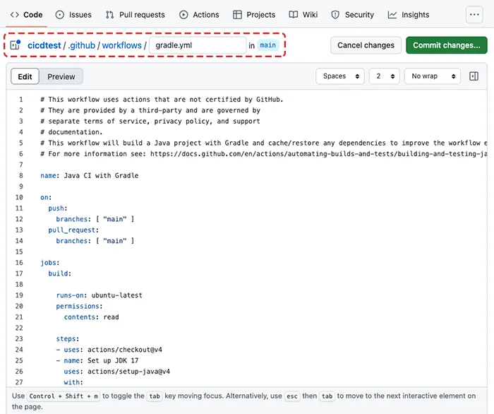 (gradle.yml 파일 저장 시에도 main branch에 바로 커밋하게 되면 워크플로가 동작하게 됩니다.)