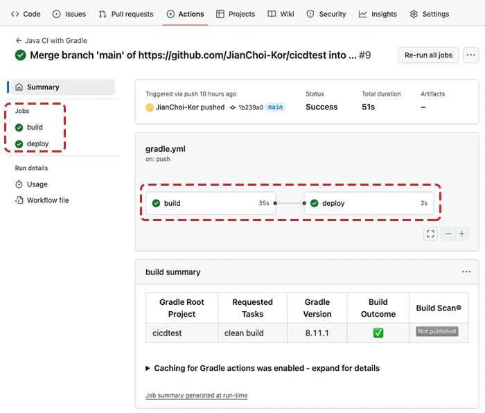 'deploy' job에서는 'needs'를 통해 'build' job이 완료된 후 해당 작업이 실행되도록 종속성을 설정하였습니다.