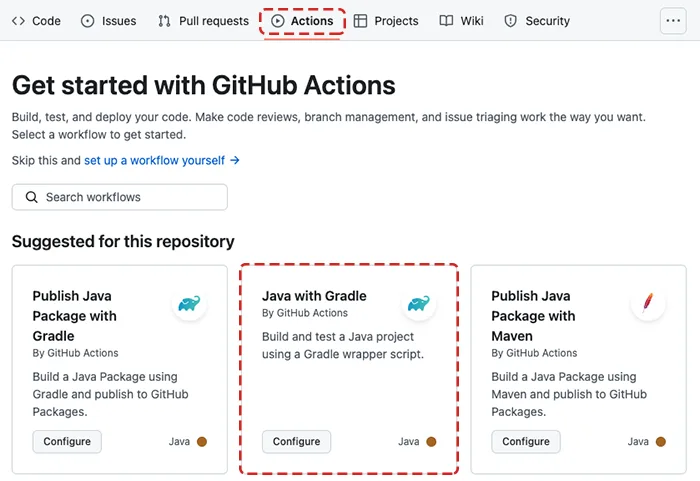 '(해당 repository)/.github/workflows/' 하위에 ci/cd를 위한 'workflow' 파일을 생성할 수 있으며, GitHub Actions에서는 다양한 자동화 작업을 위한 기본적인 workflow 양식을 제공해 주는데요.