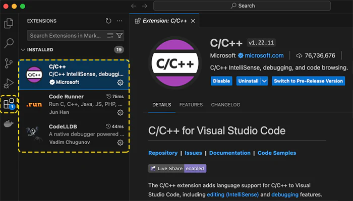 첫 번째 설치할 extension은 Microsoft에서 제공하는 'C/C++' 확장팩으로 VSCode에서 기본적으로 C/C++ 언어를 사용할 수 있도록 하는 확장팩입니다.