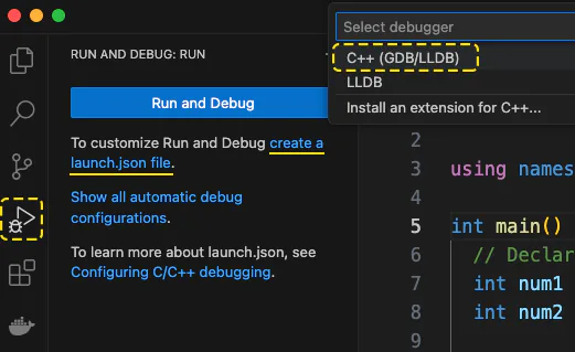 좌측 Run and Debug 탭에서 'create a launch.json file.' 부분을 선택 후 우측 'C++ (GDB/LLDB)'를 선택합니다.