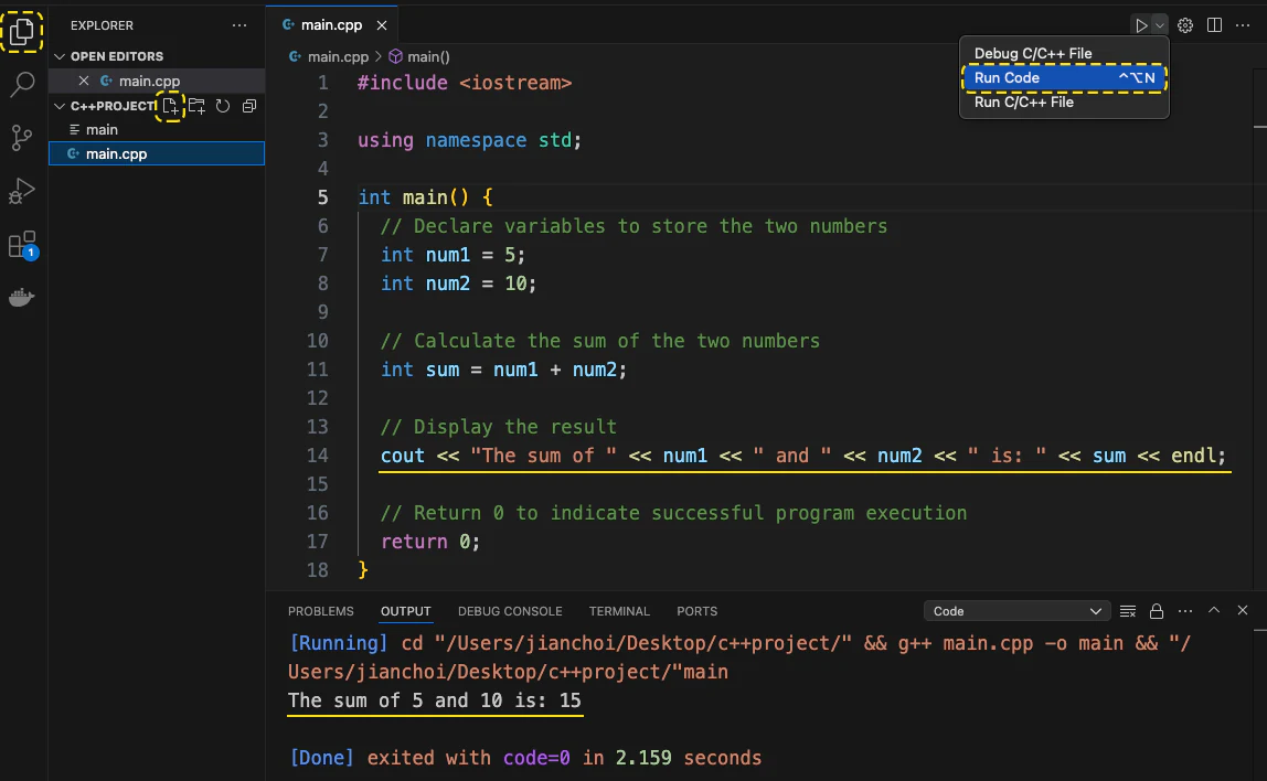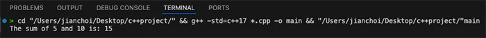 Code Runner 설정을 수정한 뒤 main.cpp 파일을 다시 실행시키면 이미지와 같이 터미널에서 코드가 실행되는 것을 확인할 수 있으며, 실행 명령어도 수정된 명령어가 적용된 것을 확인할 수 있습니다.