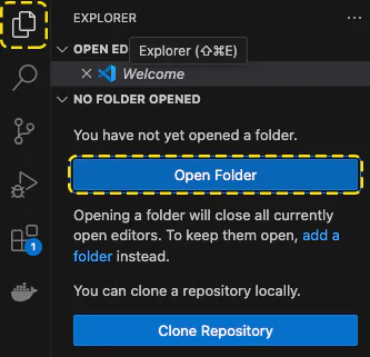이어서 프로젝트를 작업할 디렉터리를 먼저 생성합니다. 그리고 VSCode를 실행하여 이미지의 'Open Folder' 버튼을 통해 해당 디렉터리를 선택합니다.