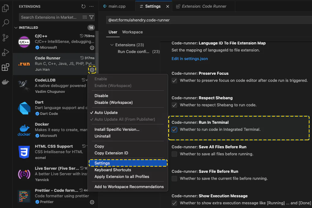 EXTENSIONS 탭에서 'Code Runner' -> 'Settings'를 통해 설정 페이지로 접근할 수 있으며, 여기서 'Code-runner: Run In Terminal' 부분을 체크하여 실행되는 코드가 터미널을 통해 실행되도록 설정합니다.