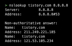 위 예시와 같이 특정 DNS 서버를 지정하여 도메인의 DNS 정보를 조회할 수도 있는데요.