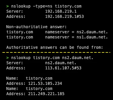 따라서 예시와 같이 NS 레코드(-type=ns)를 통해 해당 도메인을 관리하는 DNS 서버 정보를 조회하고, 해당 DNS 서버를 지정하여 조회하면 '권한 없는 응답'이라는 메시지가 발생하지 않게 됩니다.