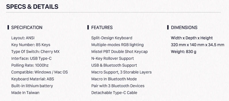 주요 스펙으로는 85키 스플릿 배열의 제품이며, Cherry MX 스위치를 사용하고 있고 핫스왑은 불가능하다는 특징이 있습니다.