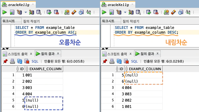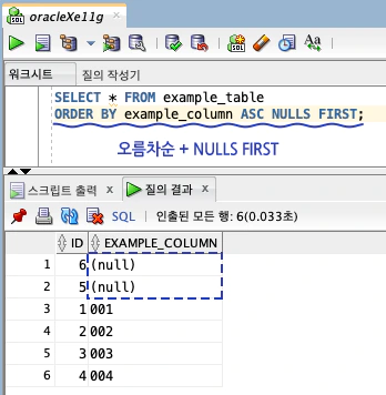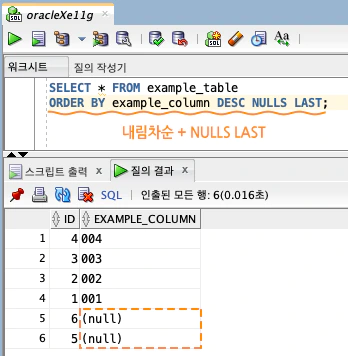 (MySQL에서는 반대로 오름차순 정렬 시 NULL 값이 가장 먼저 오고, 내림차순 정렬 시 NULL 값이 가장 뒤에 옵니다.)
