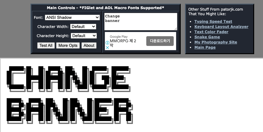 원하는 문구를 이미지화 시키는 것은 위 'Text to ASCll Art Generator' 사이트를 통해 쉽게 가능합니다.