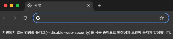 설정이 정상적으로 적용된 경우 해당 이미지와 같이 '지원되지 않는 명령줄 플래그 (--disable-web-security)를 사용 중이므로 안전성과 보안에 문제가 발생합니다.'라는 경고 문구가 출력됩니다.