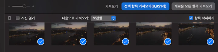 사진 백업 후 삭제 예정이시라면 해당 옵션을 사용해도 되며, 백업된 내용을 확인 후 직접 삭제하고 싶으신 경우 해당 부분의 체크를 제거하고 가져오기를 실행해 주시면 됩니다.