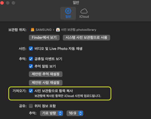 해당 옵션은 사진을 '사진 앱'으로 가져올 때마다 원본 파일을 Photos Library 패키지 안으로 복사하는 옵션으로, 외장하드의 Photos Library 안에 실제 이미지 원본이 저장되는 설정입니다.