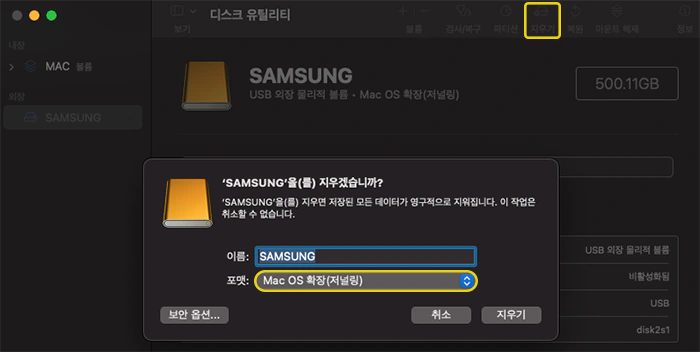 먼저 '디스크 유틸리티'를 사용하여 외장하드의 포맷을 'Mac OS 확장(저널링)' 형식으로 변경하며 초기화를 진행했습니다.