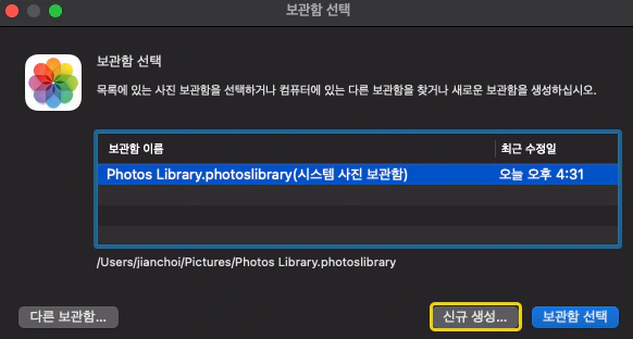 이어서 'option' 버튼을 누른 상태로 '사진.app'을 열게 되면 다음과 같이 보관함 선택 창이 뜨게 되는데요.