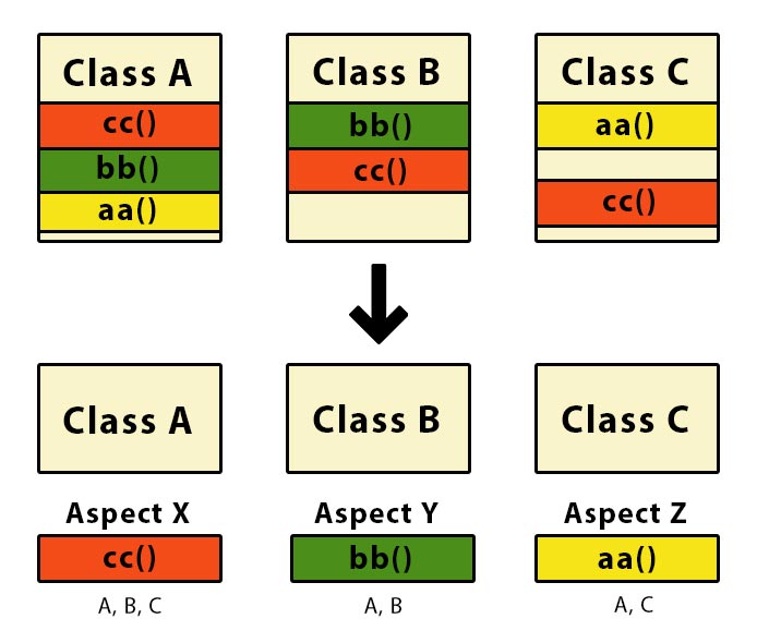 여기서 메서드 aa(), bb(), cc()는 여러 곳에서 쓰이는 공통 기능입니다. 이 공통 기능이 이미지처럼 흩어져 있으면 코드 수정이 있을 때 각각의 메소드의 코드를 다 수정해야 하는 등 유지보수, 재사용을 할 때 불편합니다.