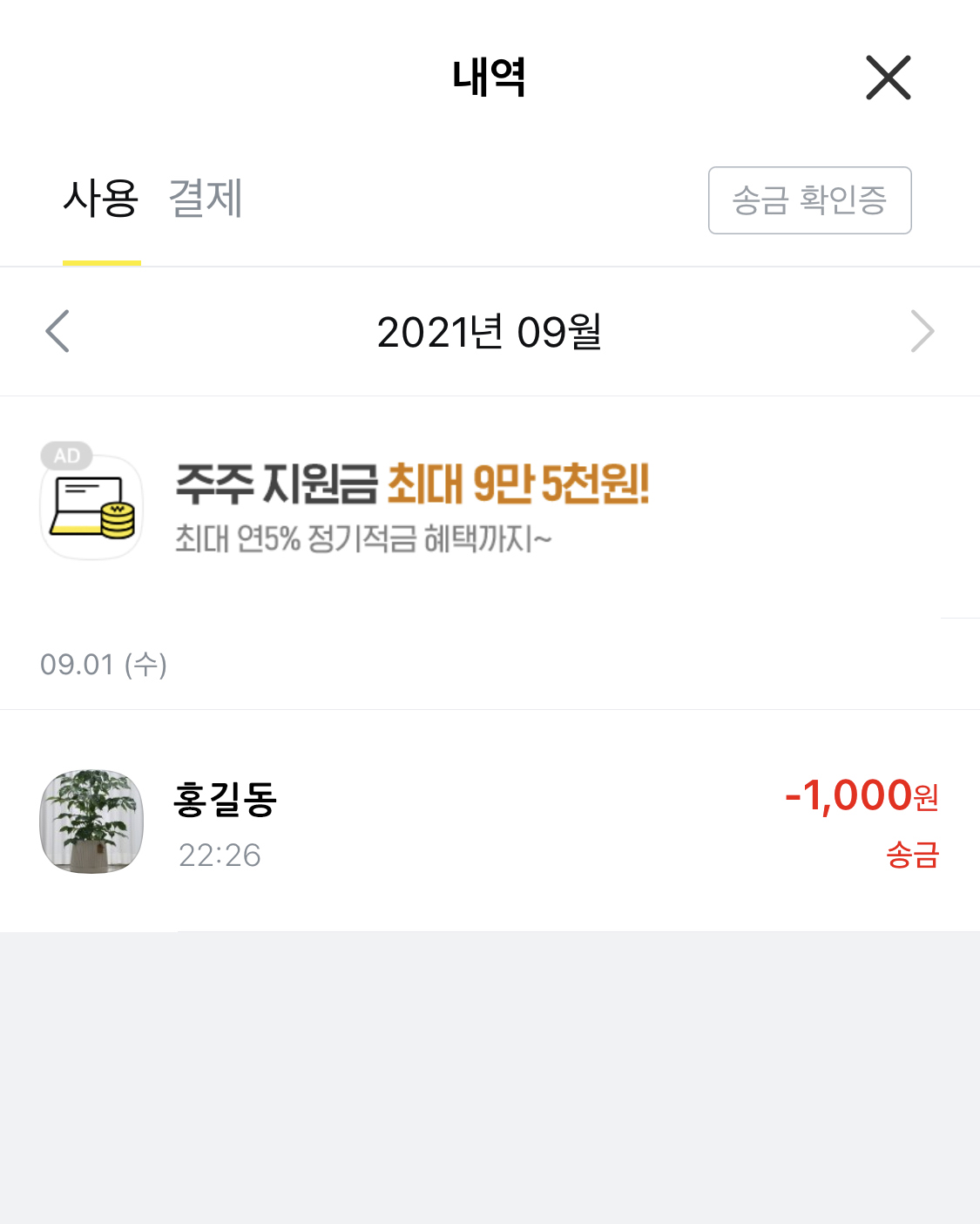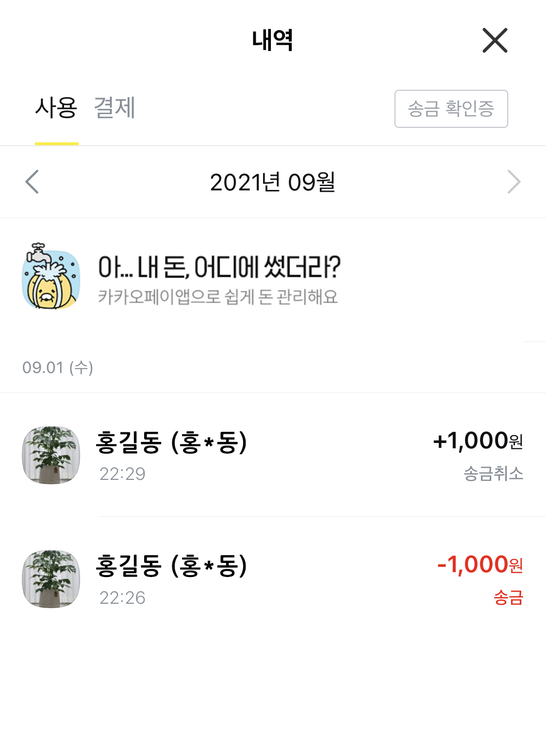 송금 취소 버튼을 누르면 해당 송금이 취소되고 카카오페이가 다시 지갑으로 들어온 것을 확인할 수 있습니다.