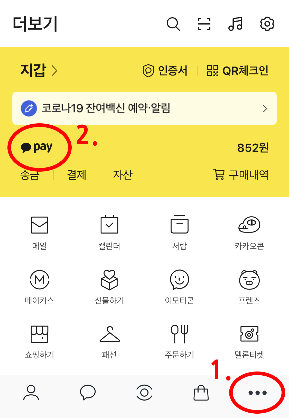 카카오톡에서 우측 하단 … 을 클릭하고, pay를 클릭하여 카카오페이 기능으로 들어갑니다.