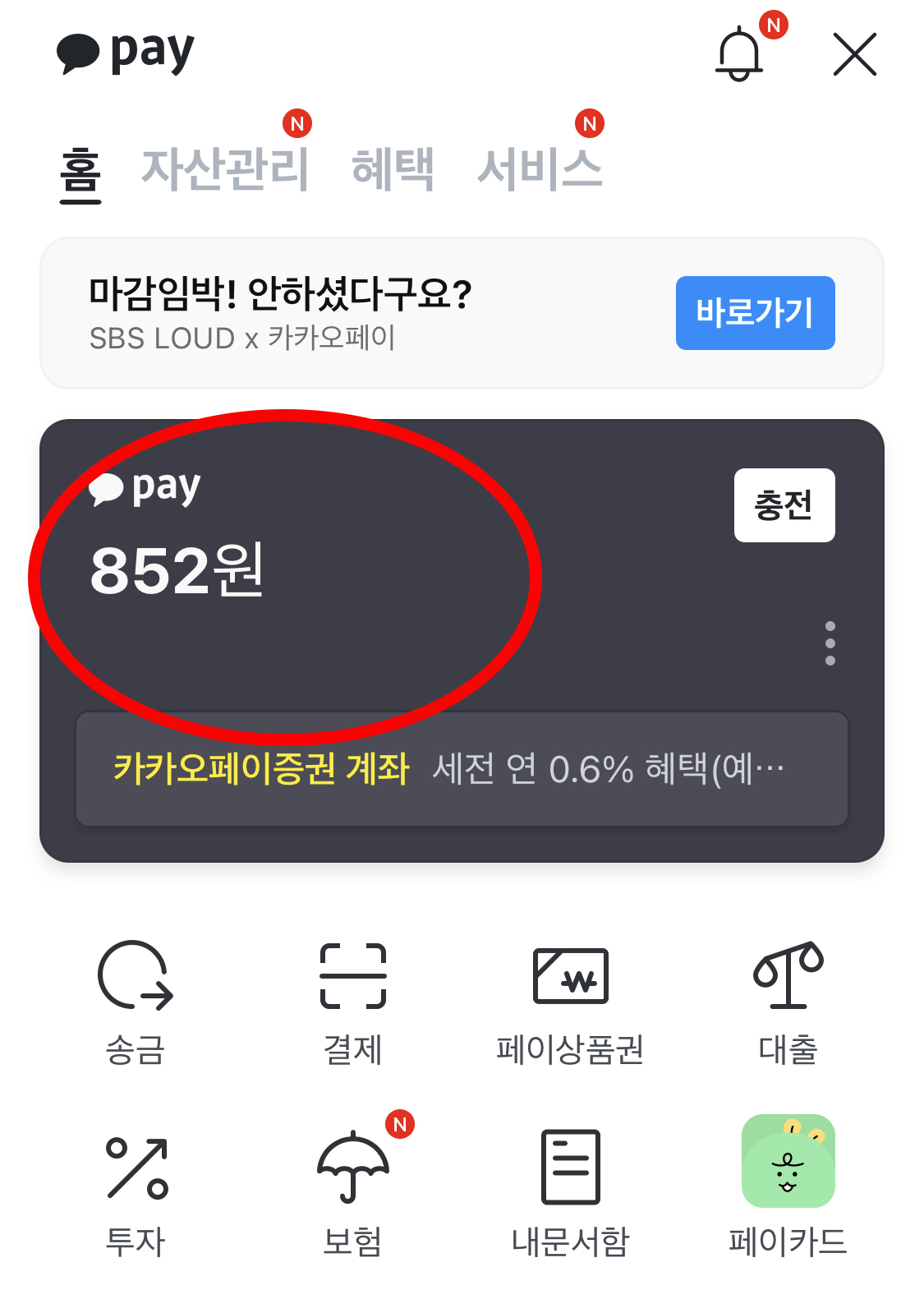 카카오페이 기능에서 중간 영역에 pay 금액 및 충전을 할 수 있는 부분으로 들어갑니다.