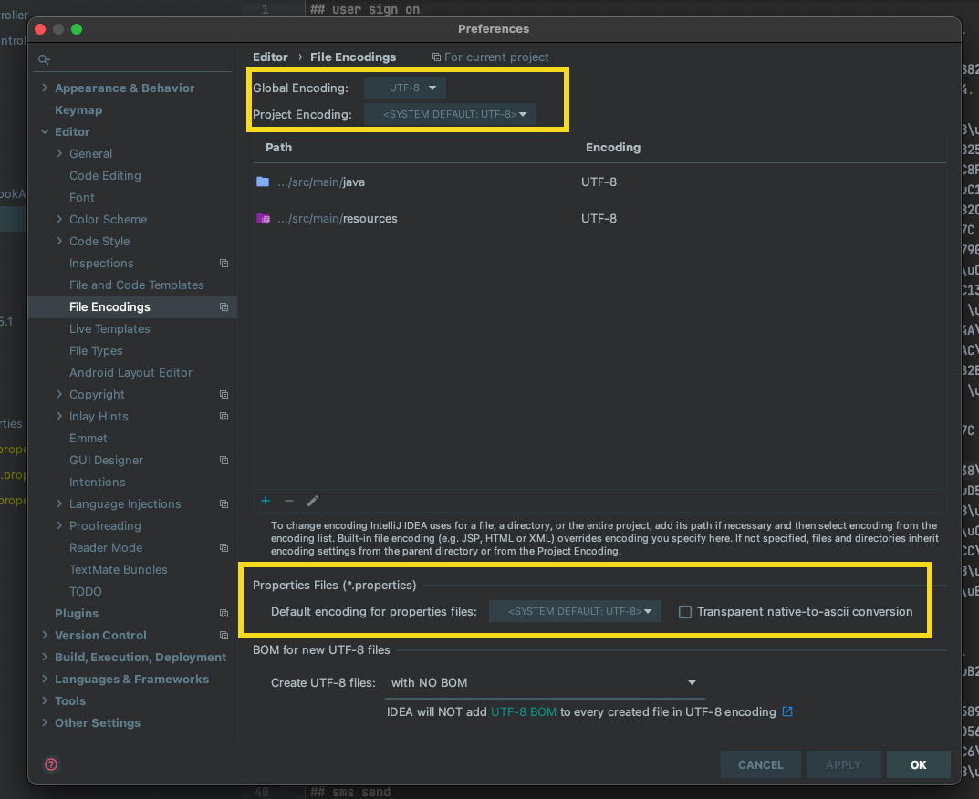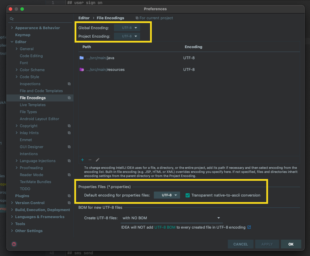 Preferences 또는 Settings -> File Encodings 를 확인해보면 상단에 Global Encoding, Project Encoding 두 가지가 있고, 아래에 Properties Files (*.properties) 설정이 존재합니다.