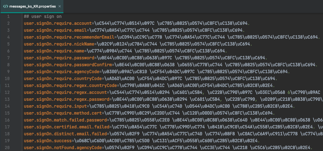 기존에 작업된 프로젝트를 clone하여 작업하는 중 properties 파일의 한글이 깨지는 현상이 발생하였습니다.