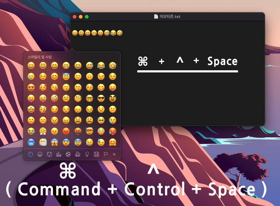 맥북에서 이모티콘을 사용하기 위한 단축키는 Command + Control + Space입니다.
