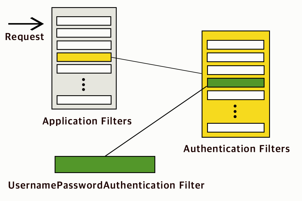 일반적으로 ID, PASSWORD 기반의 인증이라고 할 경우 가장 먼저 Application Filters라는 필터 뭉치에 도달합니다. 그리고 그 필터들 중 Authentication Filters라는 필터 뭉치에 다시 도달합니다. 다음으로 username, password를 사용하는 form 기반 인증을 처리하는 필터인 UsernamePasswordAuthenticationFilter에 도착하게 됩니다.