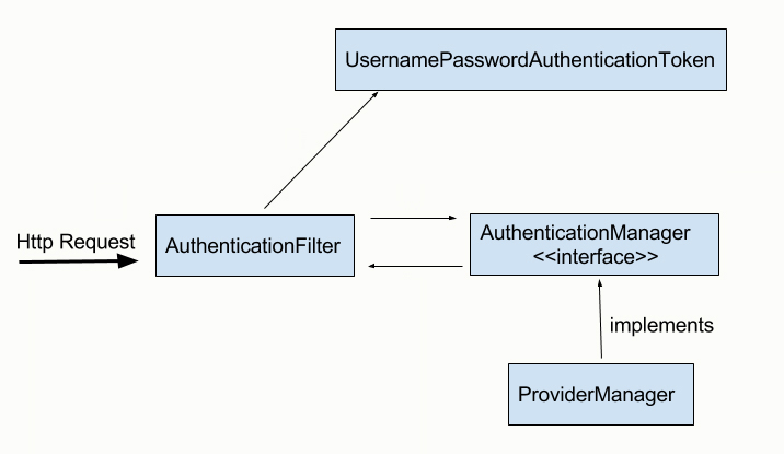 - UsernamePasswordAuthenticationToken(Authentication) 객체를 AuthenticationManager에 넘깁니다.