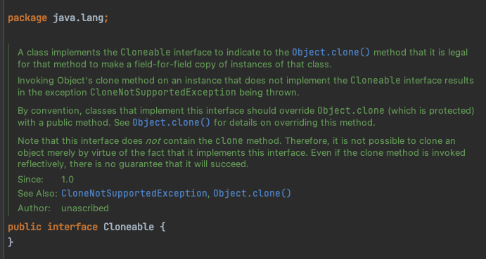 clone() 메서드는 상위 클래스 Object의 clone() 메서드를 리턴합니다.