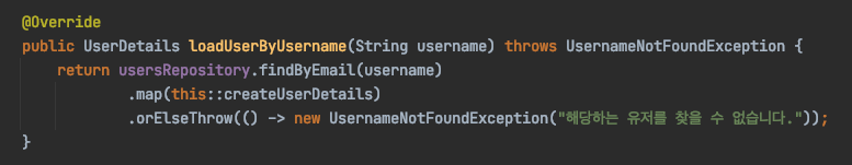userRepository의 findByEmail(String eamil)은 Optional<Users> 를 리턴하도록 구현되어 있어 .orElseThrow() 메서드로 UsernameNotFoundException을 바로 처리하도록 되어있습니다.