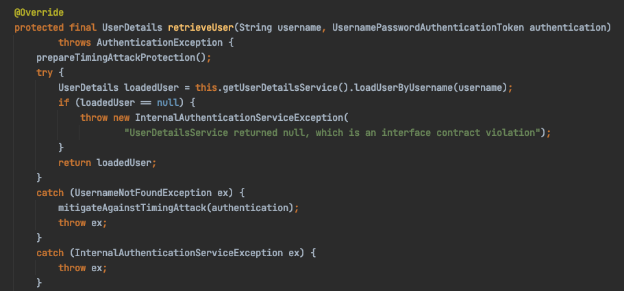 authenticate() 메서드 중 retrieveUser 메서드가 실행되고, 여기서 UsernameNotFoundException이 발생한다면 캐치하는 구조로 되어있는데요. retrieveUser 메서드를 좀 더 살펴보겠습니다.