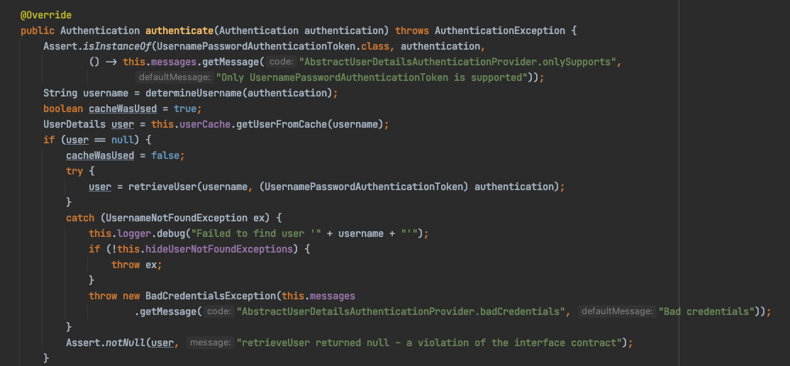 스프링 시큐리티의 동작 원리에 의해 AuthenticationManager는 인증 처리가 가능한 AuthenticationProvider를 찾습니다. 그리고 해당 인증을 처리할 수 있는 객체인 AbstractUserDetailsAuthenticationProvider의 authenticate() 메서드가 실행됩니다.
