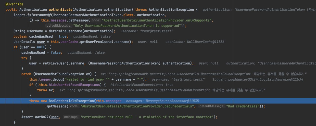 문제는 이때 hideUserNotFoundException 값이 true로 최종적으로 new BadCredentialsException을 던지게 됩니다.